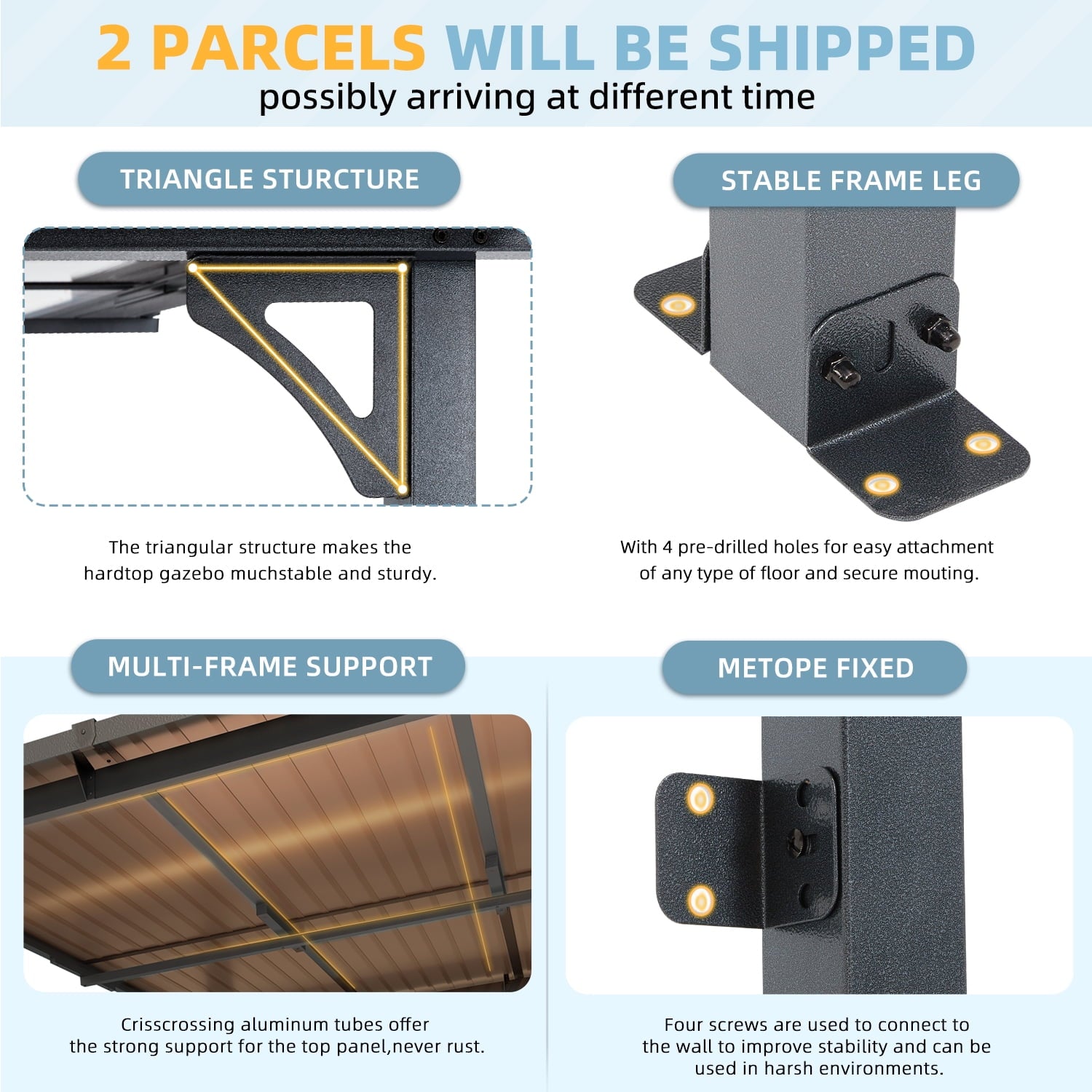 To make the great outdoors even greater, at AECOJOY, we can provide you with durable, stylish and comfy outdoor furniture that can stand the test of time. If you want to create a wonderful and comfortable outdoor recreation area, this outdoor hardtop pergola would be a great choice. You'll find it can elevates your exterior living space to the extraordinary. Sturdy outdoor hardtop gazebo built with triangular powder-coated aluminum frame, which is more stable and durable. AECOJOY makes your outdoor leisure time unforgettable. Please note: This is a wall-mounted lean to gazebo. It needs to be installed against a wall. For maximum stability, you can use the provided nails to secure the gazebo to the wall.