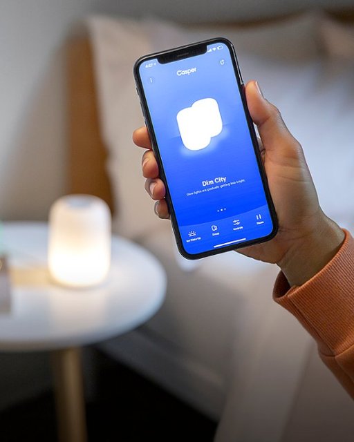 Get a relaxing night's sleep with the Glow Light from Casper. Designed for bedtime, this wireless charging touch lamp gradually dims to lull you to sleep, and gently wakes you up with a soft light. Use the easy app to schedule your daily routine. A magical light for better sleep. A light designed to help you fall asleep. Brilliant. Most lights keep us up. Even bedroom lighting. The Glow is a light that helps us wind down naturally for better, deeper sleep.